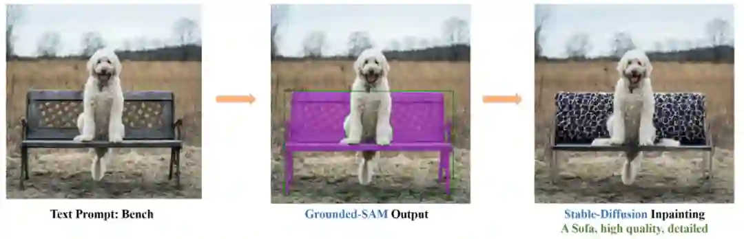 具体来说,他们使用一个 SOTA 的 zero-shot 目标检测器(Grounding DINO)提取物体 box 和类别,然后输入给 SAM 模型出 mask,使得模型可以根据文本输入检测和分割任意物体。另外,他们还将其和 Stable Diffusion 结合做可控的图像编辑。