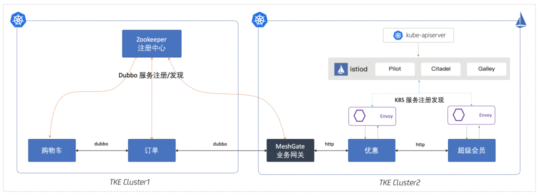 此方案充分利用 Dubbo 项目原有的代码结构,删除Dubbo原有的注册发现、Dubbo协议、Dubbo服务配置等功能,将一个 Dubbo 项目改造成一个 SpringBoot + K8S + Istio 的项目,代码修改范围可控,改造方式最彻底。