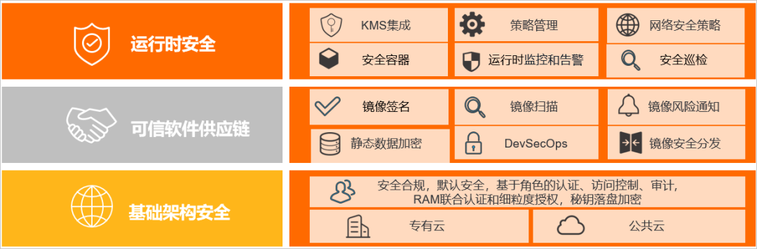 可信软件供应链:通过镜像扫描发现已知安全漏洞;通过镜像签名保障镜像来源的安全性及不被篡改;通过DevSecOps集成,实现安全左移,与开发、测试、运维等质量动作进行深度融合。