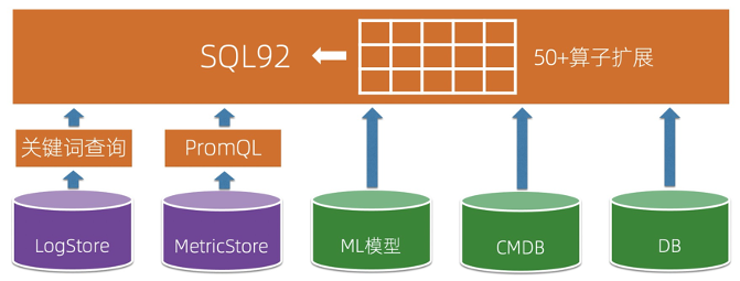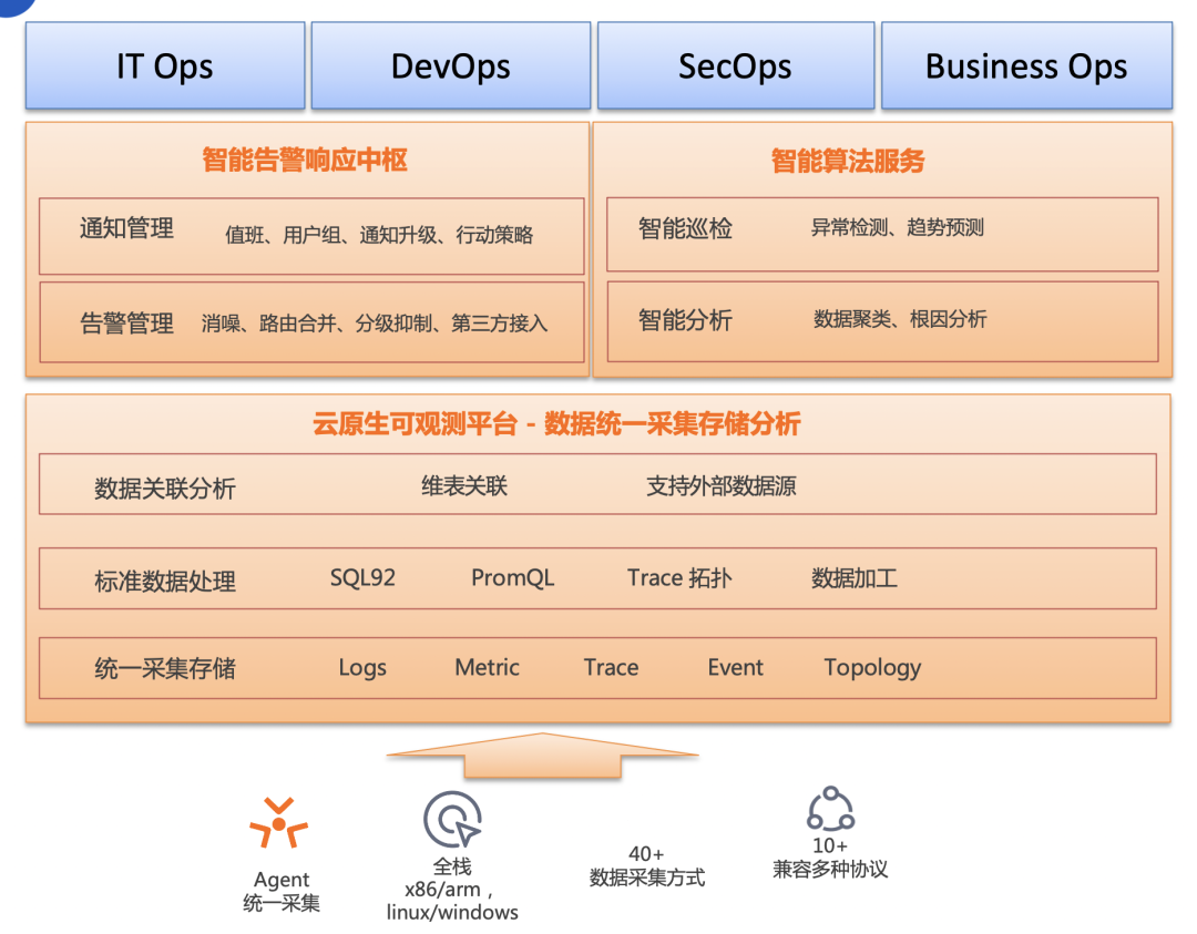 统一存储分析层:提供了针对Logs、Metric、Trace、安全事件、Topo等多种数据的存储层,并且在此基础上提供了统一的数据关联分析能力。对于不规则数据,提供了数据加工能力。
