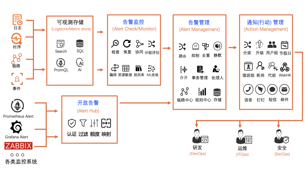 动态通知:可以根据告警属性动态分派通知。例如:测试环境的告警,通过短信通知到张三,并且只在工作时间通知;而生产环境的告警,通过电话通知到张三和李四,并且无论何时,都要进行通知。