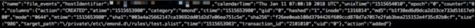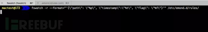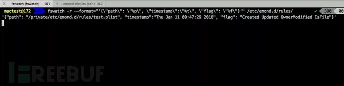 你可以注意到fswatch可以在事件触发时提供时间戳。 此外,你可以将其输出到任何其他命令行,以便进一步处理。 你也可以指定多个目录进行监控。 下图显示了一旦我们在rules目录中放置了一个plist文件,fswatch将以一个JSON字符串显示事件详细信息。