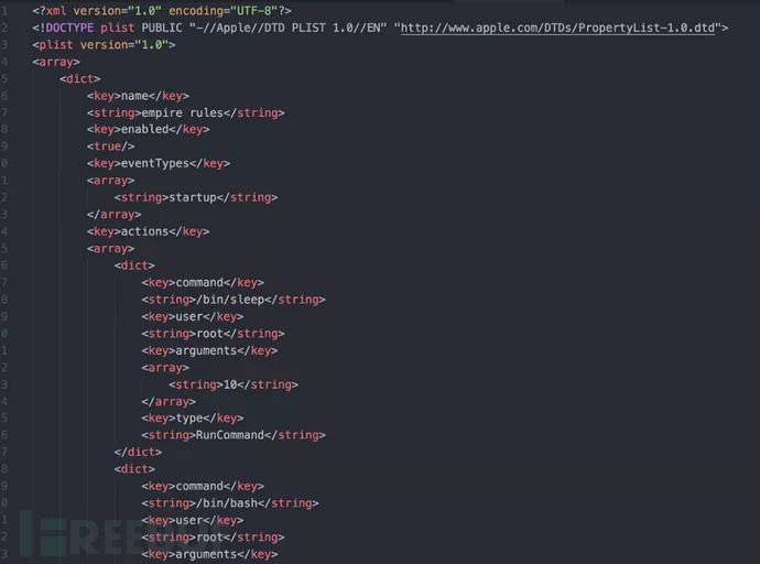 规则文件被存储在/etc/emond.d/rules/目录中,且应该为plist格式。在该目录下已经有一个示例规则文件了(SampleRules.plist),该示例定义了名称,类型和事件触发后的操作。事件有几种类型(startup, periodic, auth.success, auth.failure等),在这次的演示中我们只使用startup。一旦被emond加载,startup事件类型就会触发规则;periodic事件类型只有在定义了“startTime”之后才会触发;同样的,auth.success事件类型只会在用户成功验证后触发;auth.failure会在验证失败事件上触发,还有其他的一些事件类型就不一一列举。action定义了事件发生后emond将要做什么,需要注意的是,我们可以在规则中定义多个action。只有少数action可以被用于恶意目的(如运行命令和发送电子邮件),你可能已经猜到了,运行命令可以允许你执行任意系统命令,对于发送电子邮件,目的不言自明。对于本演示,我们将重点介绍执行命令。