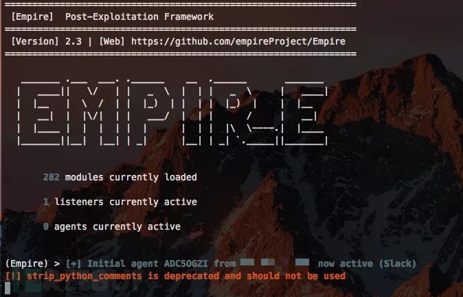 一旦服务开始,如果你已经定义了一个startup事件类型,那么事件将会立即发生并触发任何action。 现在,我们应该可以看到Empire会话建立了。