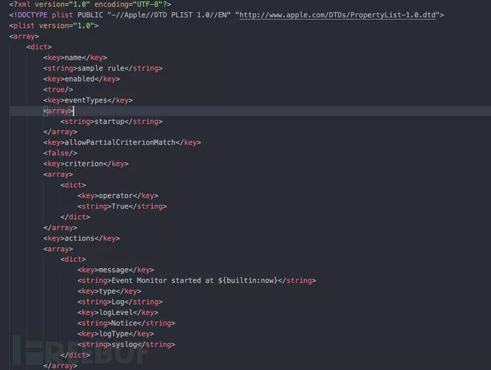 现在我们可以演示如何利用事件监视进程来建立持久化访问。 emond的机制与其他任何LaunchDaemon相似。 Launchd负责在启动过程中执行所有LaunchDaemons和LaunchAgent。 由于emond是在该过程中启动的,所以当使用执行命令时,应该注意一下你正在执行什么命令,以及在哪一个过程应该执行哪个命令。 这一点非常重要,因为事件发生然后触发action(执行命令)的时候电脑很可能没联网,所以任何需要网络访问的命令都没法用。接下来,我们会展示如何创建规则文件。