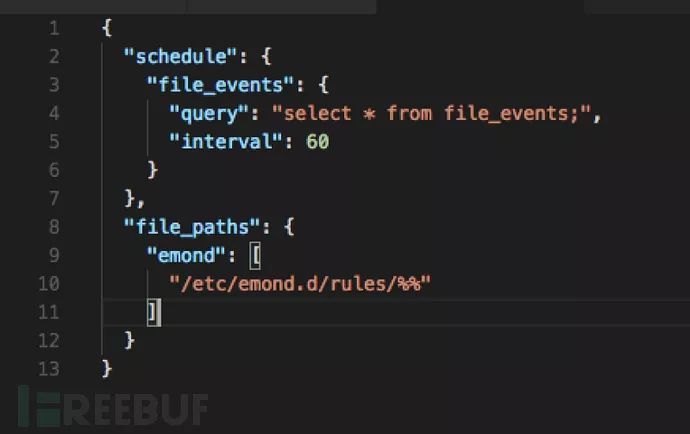 当然这只是一个最基本的例子,可能不适用于部署在大型MacOS环境中。对于后者,更适用的选择是osquery。Osquery提供文件完整性监视,它使用fsevents api将文件系统更改记录到特定目录的文件。 更多信息可以点击这里。安装osquery之后,你需要提供一个配置文件来监视文件系统事件。 下图是一个简单的示例来监视rules目录中的所有文件系统事件。 所有事件将以60秒为间隔进行查询。