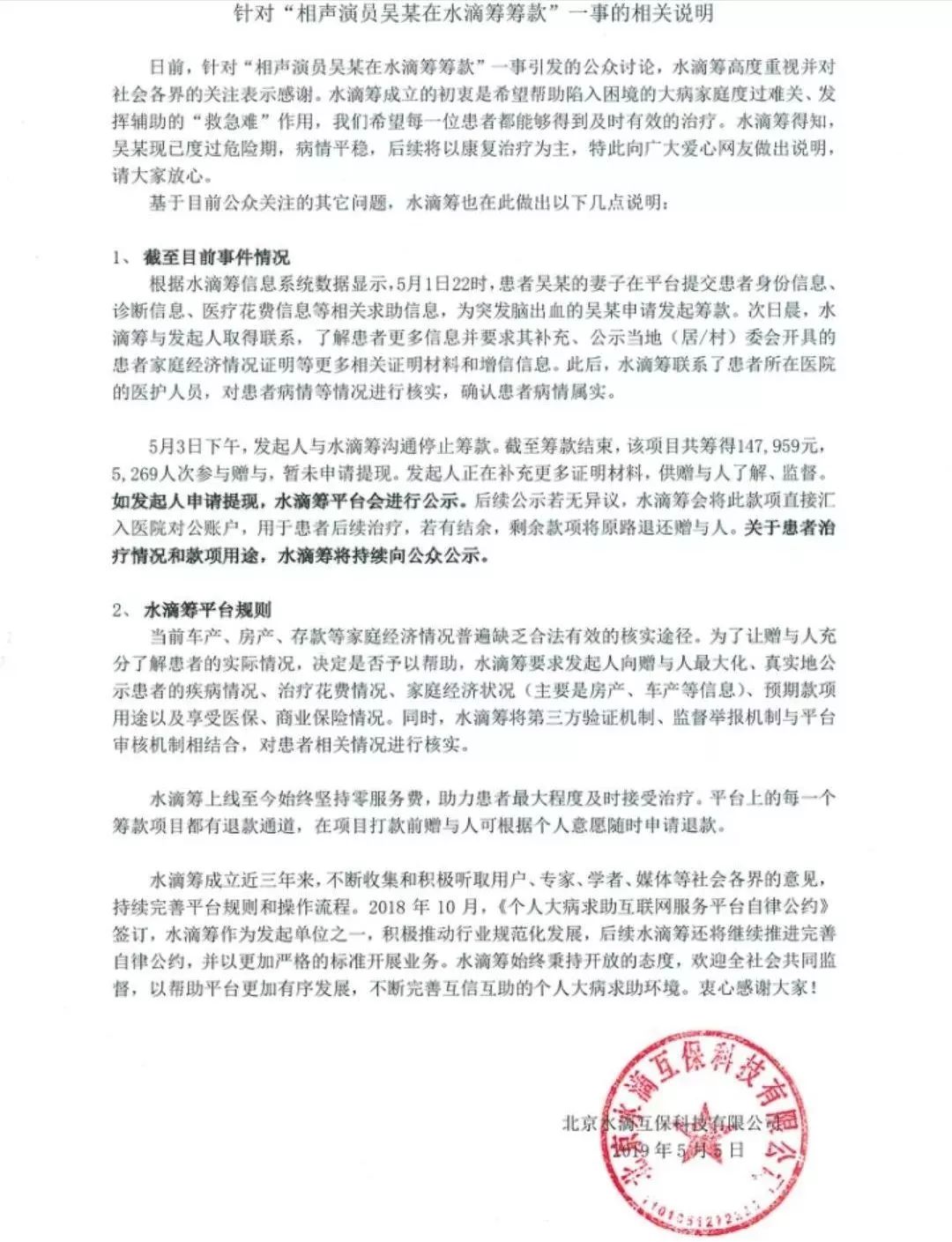 5月5日,水滴筹官方作出说明称,当前车产、房产、存款等家庭经济情况普遍缺乏合法有效的核实途径,为了让赠与人充分了解患者的实际情况,决定是否予以帮助,水滴筹要求发起人向赠与人最大化、真实地公示患者的疾病情况、治疗花费情况、家庭经济状况、预期款项用途以及享受医保、商业保险情况。