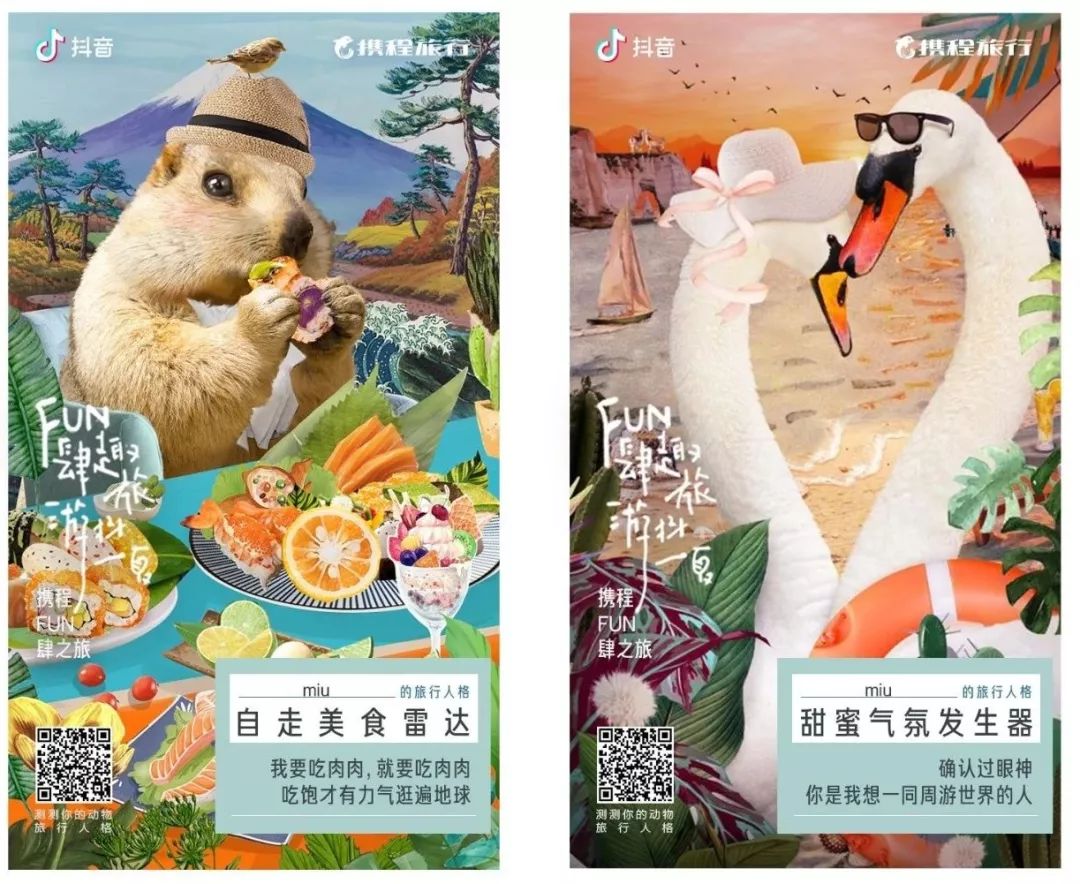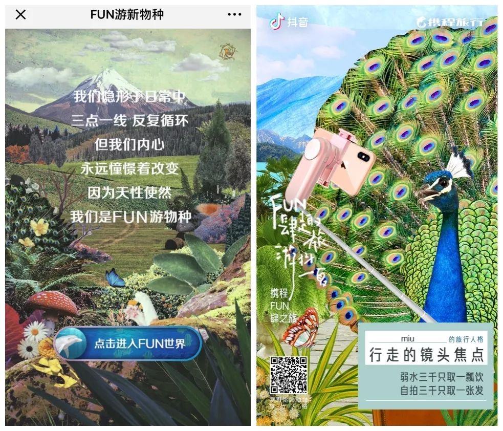 为配合这次旅行季的开展,携程旅行在抖音上开通了官方账号“FUN肆趣旅”。同时,为了配合传播,抖音为本次活动精心制作了一条有趣有料的“FUN游物种”H5。