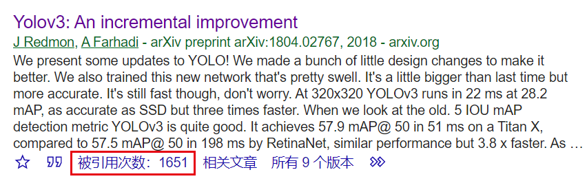如今时隔快两年,YOLOv3并没有进化到YOLOv4,但不影响大家对YOLOv3的关注度。下面是Amusi在谷歌学术上找到的YOLOv3引用量:1651。两年内达到这个引用量,实则相当恐怖!