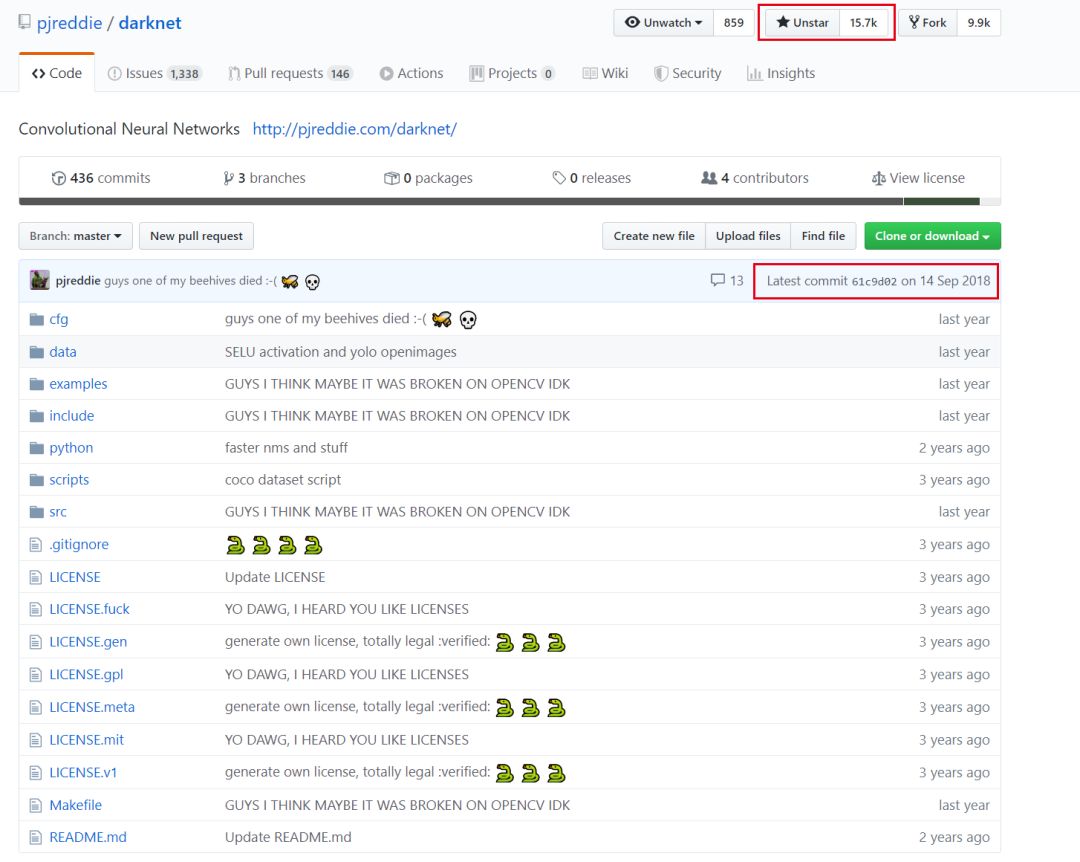在 github 上 YOLOv3 已获得15.7k的star,据 Amusi了解,检测为主的开源项目,darknet应该就仅次于 Facebook家的Detectron,其是22.5k star。