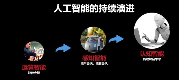 现在大部分人工智能还停留在感知智能阶段。感知智能包括语音识别,就包括翻译、人脸识别等,但真正对内容的理解没有那么深。而更高一级,认知智能是更高层次的对内容的认识,这是真正人工智能的必经之路。