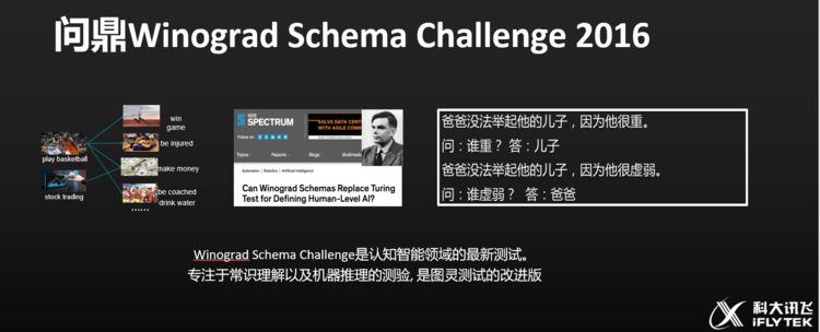 过去我们通过图灵测试测试机器的认知程度,现在很多机器都可以达到这样的水平,所以就有了改进版的测试方式 Winograd Schema Challenge,它从一些常识性的知识推理来看机器是否达到了认知。