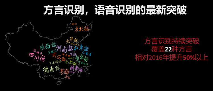 方言识别方面,科大讯飞现在能识别至少 22 种方言,这是很有用的。比如今天在成都,其实四川话的识别就和标准普通话的识别完全不同。我们可以做到用标准的四川话来讲,如果大家用科大讯飞的语音输入法就知道这项技术的方便。