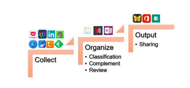 上图主要显示了我们知识管理的主要工作流程,分为三个简单的步骤:收集、组织和输出。