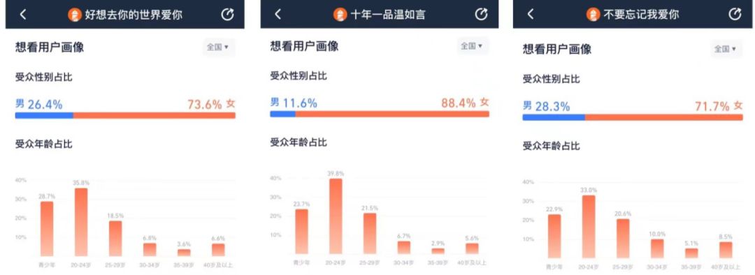 比如灯塔专业版数据显示,今年情人档上映的三部影片,女性受众都高达70%以上,最高的《十年一品温如言》甚至高达88.4%。而24岁以下的受众,占比高达63.5%。