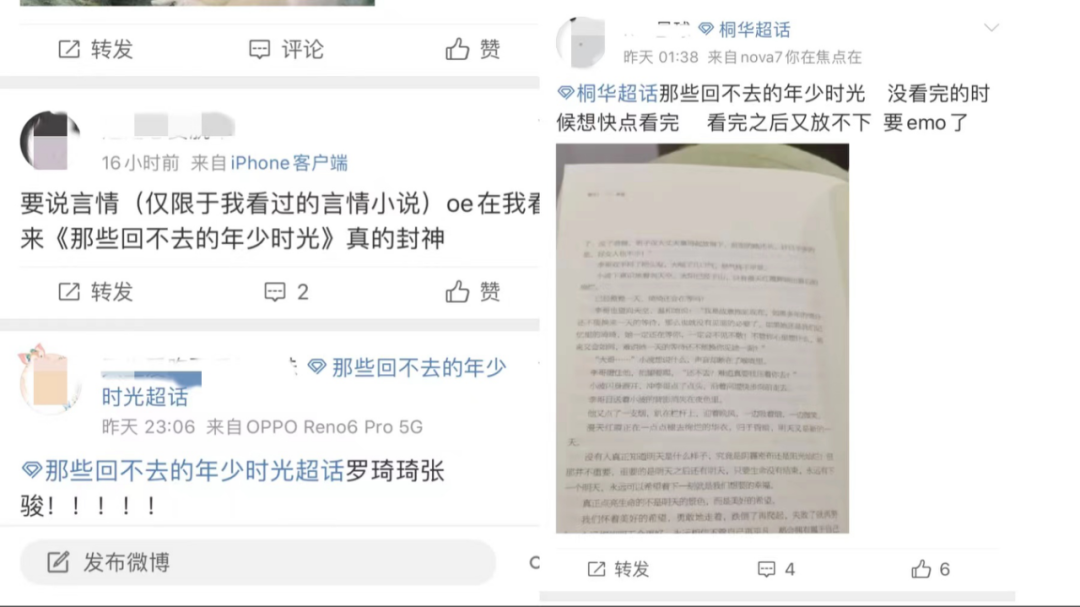 以《那些回不去的年少时光》为例,1月至今,豆瓣新增的书评就不下于80条,微博近一个星期新增的《那些回不去的年少时光》讨论不下于60条。点击最近分享的微博查看,都是十几岁的初高中在校生。