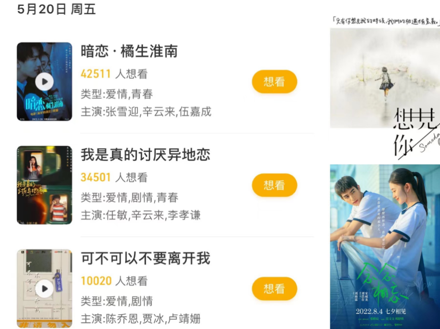 看来,在接下来的档期都会出现不少爱情片。比如“520”档期还有一波爱情片来袭——光线的《我是真的讨厌异地恋》、微峰的《暗恋·橘生淮南》。
