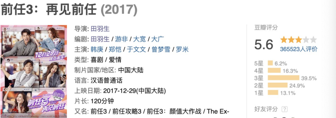 比如我们国产爱情片的票房天花板《前任3》,豆瓣评分才仅为5.6分,但是它的猫淘评分高达9分。而且无数观众声称被感动了,去电影院二刷、三刷,造就了19亿的国产爱情片票房纪录,至今没人打破。