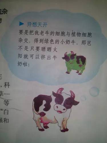 要是把老牛细胞与植物细胞杂交,得到绿色的小奶牛,那岂不是只要晒晒太阳就可以挤出牛奶啦!