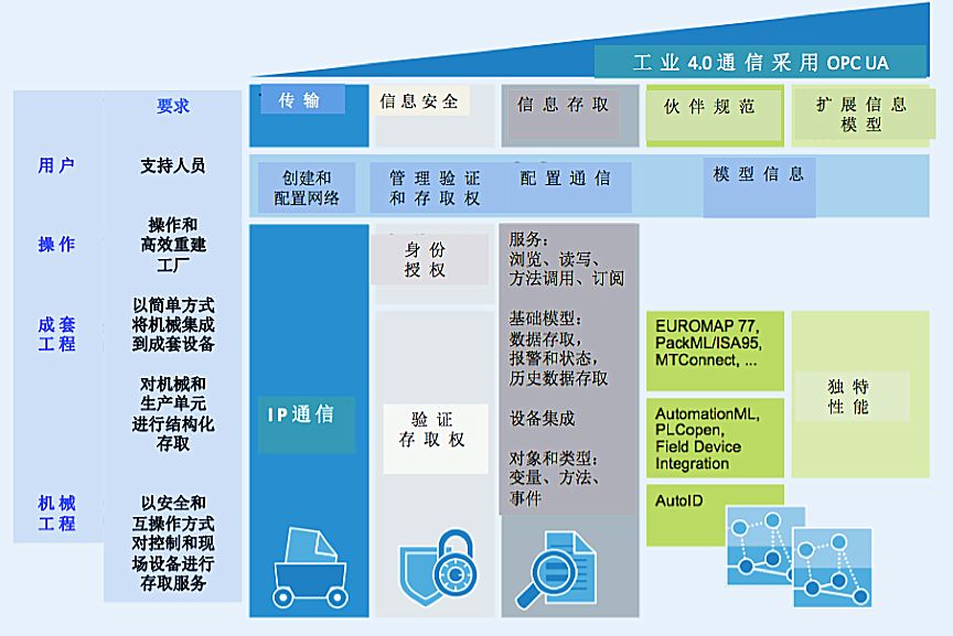 当前在德国,开放平台通信统一架构OPC UA的标准被公认为是一种有前途的、实现持续信息交换的方法。因此它已经成为工业4.0未来标准的主要候选者。德国机械制造协会VDMA与Fraunhofer IOSB发布了针对中小型机械制造企业如何在今后导入OPC UA及其迁移的可能策略的导则。导则明确的强调,OPC UA不是自动化实时通信的另一个标准,而是一种为目前尚处于信息孤岛的设备之间建立附加通信通道的工具。在工业4.0中,其主要任务为新的服务提供信息传输,而不是替代现有的实时通信协议。由于OPC UA只是实现新的客户场景的工具,所以没有必要等待客户对OPC UA提出明确要求才开始行动。特别是对于成套设备和机械制造厂商,应面该考虑的是实现这些场景大部分要建立在独立于供应商的基础上,而且保证信息交换的可互操作性。