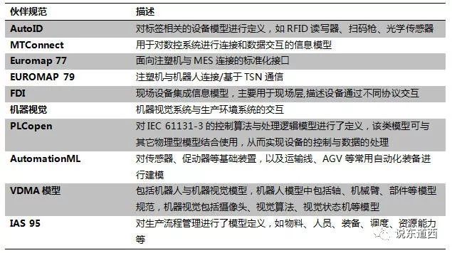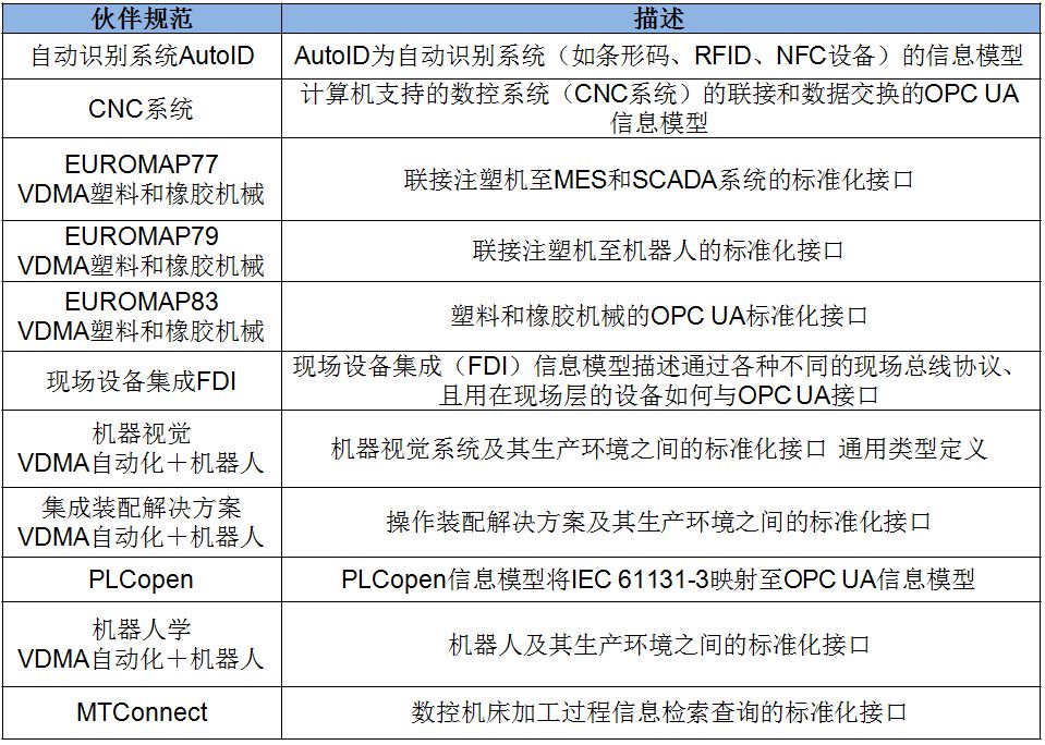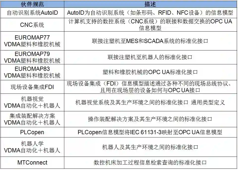在一个大型的工厂里,典型的例如电子制造业,其工厂内就包含了注塑机的塑料件成型,钣金成型,以及后道产品包装,以及物流,这个对于一个工厂而言,各种垂直行业的信息模型都是可能需要的,那么,这就是OPC UA伙伴信息模型要解决的问题,与之对应的信息模型如下表: