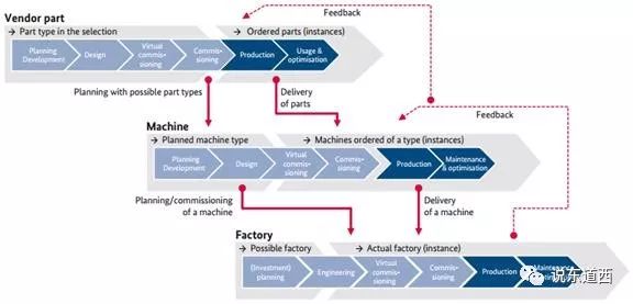 在以上顶层设计概念的基础上,就有可能为所有现有的工业资产提供数字化的实现。人们常说智能制造的基础是数字化,数字化的核心是建模。那么我们就来观察一下德国工业界是怎样进行这一过程的。