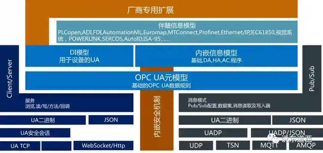 图4来自Uwe Steinkrauss在2018年展会上关于OPC UA传输机制和信息模型扩展的架构,我们可以看到,OPC UA支持传统的Client/Server传输模式,为了响应更为广泛的大数据、云计算应用模式也融入了Pub/Sub的机制,如MQTT,AMQP,UDP都是属于Pub/Sub机制,Pub/Sub机制主要是为了增强信息交互的效率和实时性,包括TSN也被理解为一种Pub/Sub的支持通信方式。