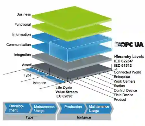 实际上,在RAMI4.0参考架构中,关于信息的传输、安全、信息访问、行规、扩展信息模型等均采用OPC UA来实现,通过OPC UA将不同的传输机制予以集成、安全机制纳入其架构、基础信息模型、垂直行业信息模型,使得OPC UA能够成为各个不同单元的数据交互的统一规范。