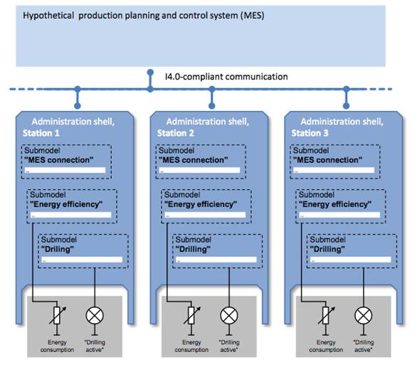 下面给出一个简单的场景描述以市场为导向的资产数字化的交互过程(见图10)。图中示出3个工业4.0基本单元(生产工作站),它们之间通过符合工业4.0的通信连接,并且还与假定的MES生产调度执行系统项连接。这3个工作站都有相同的子模型,但有不同的标识符和不同的性质数据。