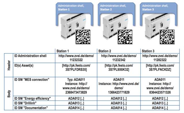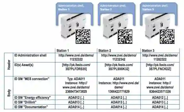 图11给出这个示范实验的识别。报头由两部分构成:管理壳标识部分和资产标识部分;而报文则包括MES连接子模型的识别符,能效子模型、钻孔子模型和文档子模型的识别符。