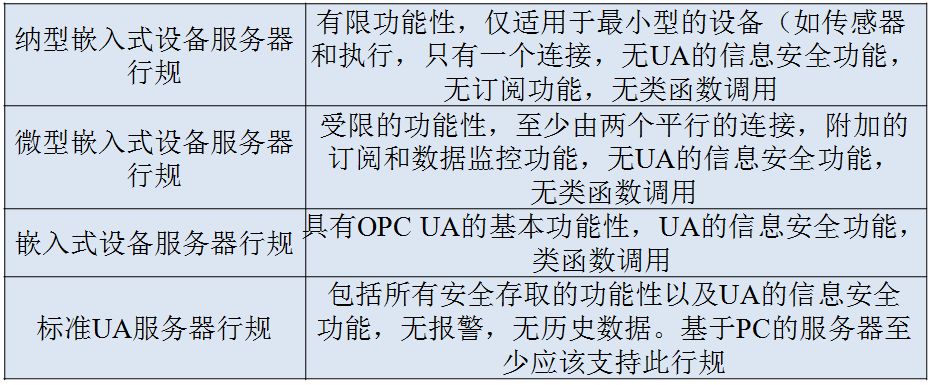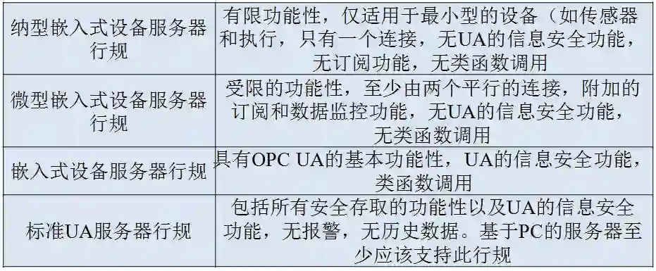 表2给出OPC基金会有关OPC UA服务器的行规,根据设备的大小分别有纳型嵌入式(Nano Embedded) 、微型嵌入式和嵌入式服务器行规和标准服务器行规,功能性也有相当大的差别,因而对实现的硬件资源要求(如计算能力、内存等)也有很大差异。顺便指出,在OPC的概念中,OPC服务器是指提供数据的设备,OPC客户端是指使用数据的设备。