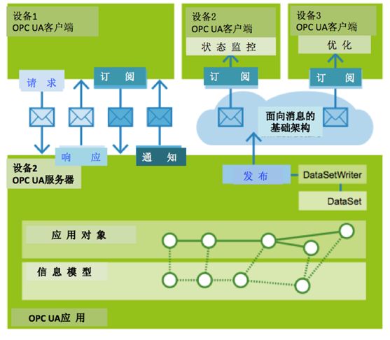 客户端-服务器通信直接实现客户端和服务器之间的数据交换,消息的接收是被确认的。发布端-订阅端通信类型适合于间接的数据交换,发送者和接收者无需彼此知晓,也无需同时被激活。它适合于大量的传感器与一个接收器相通信的场景(例如云端的状态监控和优化服务),或一个发送端和多个接收端的场景。一台注塑机可以同时向公司的多个不同的服务器(如可视化、MES或节能系统)发送其材料用量和能源使用量的测量值,就是后面那种应用场景。