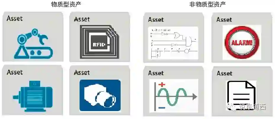 工业现场的资产由“人机料法环”构成,这些资产可划分为物质型与非物质型两类:物质型资产(又称物理型资产)包括生产性装备、物料、摄像头、仓储设备、扫码枪、传感器、自动化系统等;非物质资产(又称软件资产)包括生产工艺、控制算法、分析算法、报警逻辑、数据文件等,如图2所示。