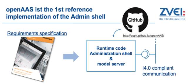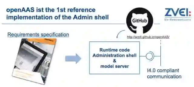 复杂的工业4.0基本单元可能涉及到不同的工程专业,这是建立复杂基本单元首先要考虑的。由德国电气行业协会ZVEI组织支持开发的OpenAAS是第一个管理壳的参考实现(详见图13)。它是专为开发团组设立的开放型智能体项目,不仅仅开源,而且可以经由GitHub进行深度学习(DL)。第一个管理壳的参考实现是按照ICT规范(通用建模语言)、基于免费的OPC UA而发展出来。