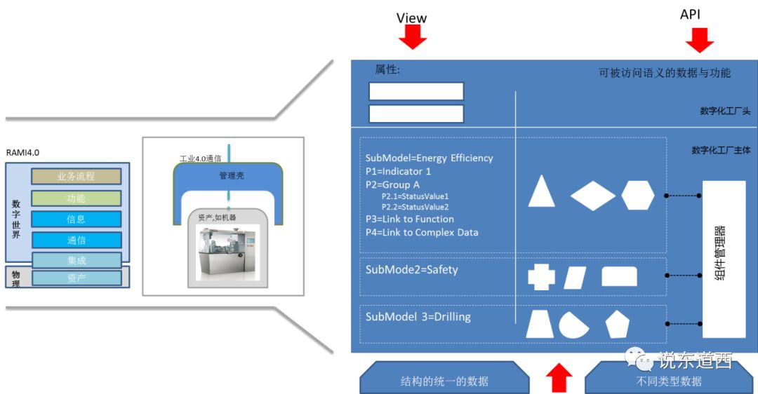 图9是管理壳、子模型、性质、复杂数据和功能的示范内容。从可视的角度看,一个经标识的资产其管理壳也是经标识的,都是显性化的知识,即表征这个资产的性质。而其数据和功能都是可通过APIs被语义化存取的。资产的运行时数据都遵照严格而统一的格式表达性质的集合(图示中子模型1是能效,子模型2是安全,子模型3是钻孔)。而有关数据和功能的运行时的数据则按照不同的互补的数据格式。
