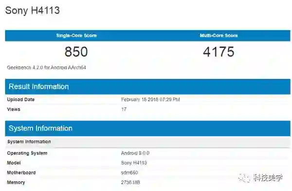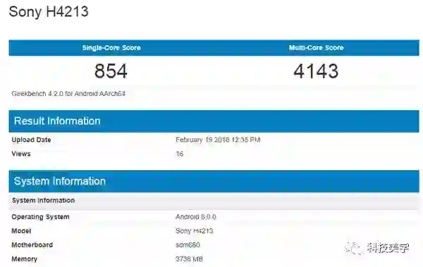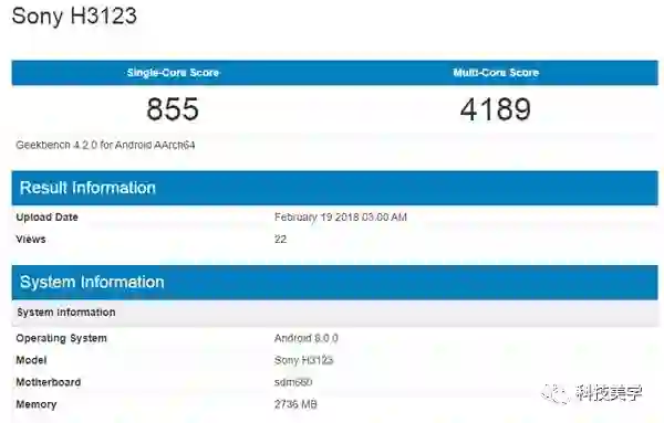 2月21日,三款型号分别为H3123、H4113和H4213的新机现身跑分网站GeekBench,这三款新机均搭载了高通骁龙660处理器,预装安卓8.0系统。其中索尼H3123和H4113均配备了3GB内存,而H4213配备的是4GB内存。