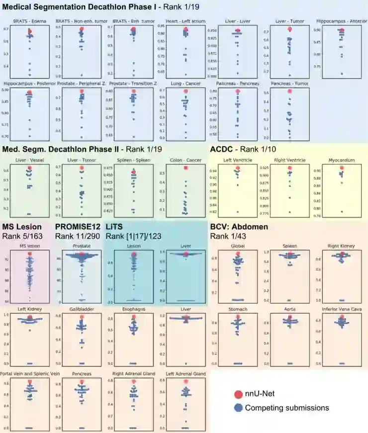 图1所示:nnU-Net在各个医学分割数据测试集的性能。所有的排行榜提交都被绘制在上图(截止到19年3月25日)。Decathlon, LiTS, ACDC and BCV的数值为Dice得分,MS lesion和PROMISE12使用了不同的指标。
