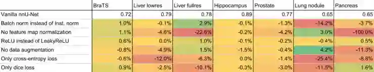 表格2显示了为验证nnU-Net中的选择而设计进行的消融研究。所有实验均在Decathlon第一阶段的代表性数据集上使用相同的数据划分进行的。这些结果一方面表明我们应该修改使用Leaky ReLUs,另一方面验证了我们选择的实例规范化、数据增强和损失函数的效果。