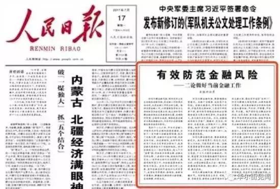 7月17日,全国金融工作会议召开后的首个工作日,《人民日报》在头版刊发评论员文章《有效防范金融风险》,文中提到:防范化解金融风险,需要增强忧患意识。……既防“黑天鹅”,也防“灰犀牛”。对各类风险苗头既不能掉以轻心,也不能置若罔闻。