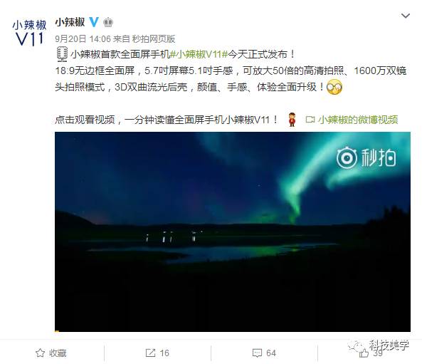 早在9月初,小辣椒就开始在微博预热自家全面屏手机。经过约半个月之后,小辣椒于今天下午在微博正式公布了小辣椒V11全面屏新机的相关信息。