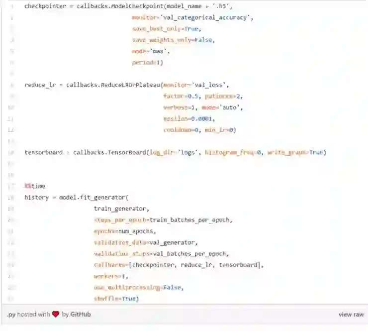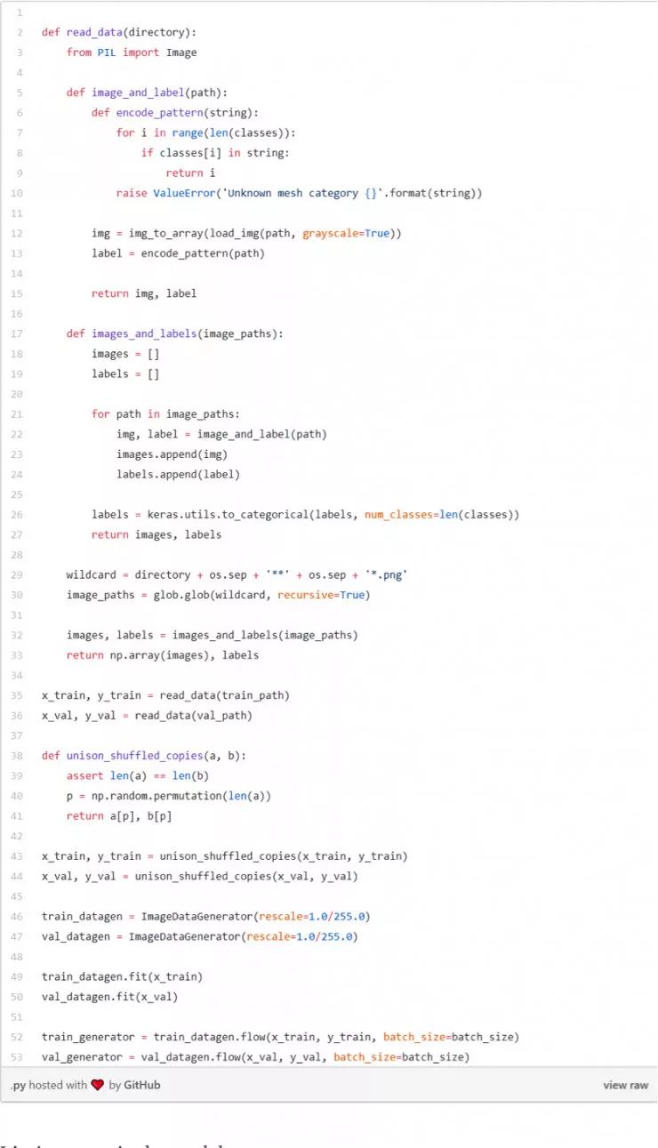 模型准备就绪并编译完成后,读取数据,然后将其刷新,并通过图像尺寸调节创建 ImageDataGenerator。请注意,数据预先按照 70:15:15 的比例进行了训练、验证和测试。由于图像是合成的,并且代表了3D 物体,因此数据无法进行扩增,因为: