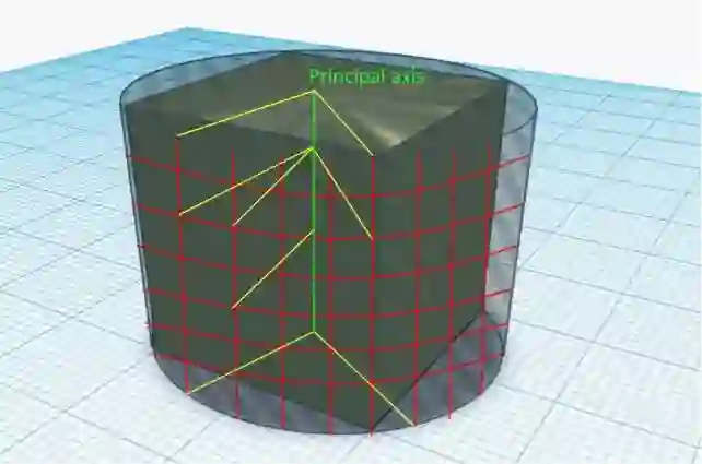 绿色是主轴,红色是网格,黄色是几何投影线。