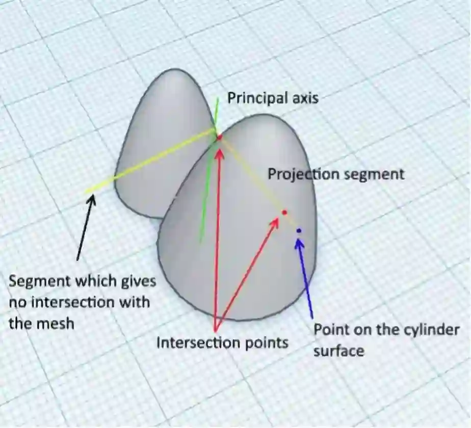 现在将每个网格节点垂直投影到主轴上并获取一组投影点。投影点集合由P表示。投影线集合由S表示。