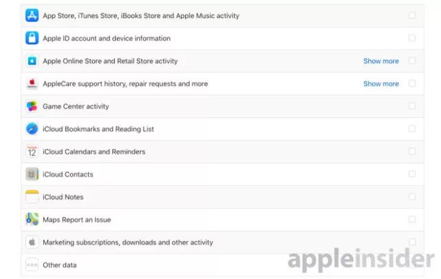其中最主要的功能是“获取你的数据备份”,包括了大量的用户个人信息,比如购买和应用的下载历史、以及用户允许储存在苹果服务上的数据。可供下载的数据类型包括Apple ID和设备数据、在线及苹果零售店活动、AppleCare支持历史和请求、游戏中心和苹果在线商店各种相关的活动。