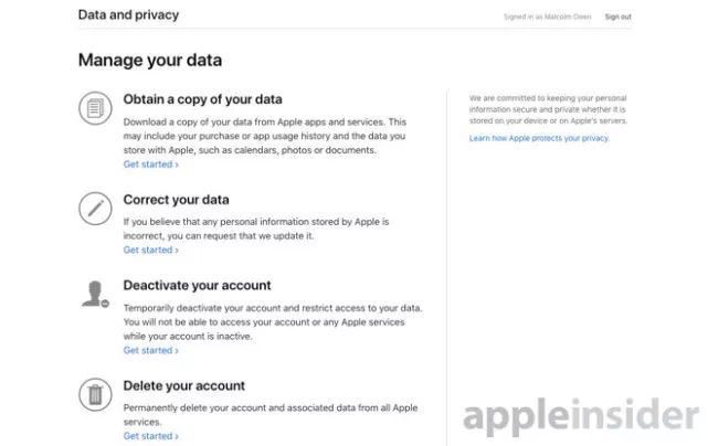 苹果该项数据与隐私网站计划最初在今年3月公布,本周三正式率先在欧洲地区上线。对所有想要获取自己被上传到苹果服务器信息的用户来说,这个网站提供了一站式的服务,可以允许iCloud和苹果其它服务的用户管理自己的个人数据,包括修改或者直接从苹果的服务器中删除。