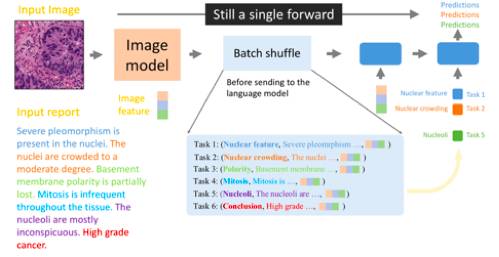 因为医学诊断报告比较长并且表述了多个图像特征,我们将整个报告的拟合转化为多个特征描述句的并行拟合(用 Batch shuffle 在训练时完成),即让一个 LSTM 前馈只专注于一种特征描述。