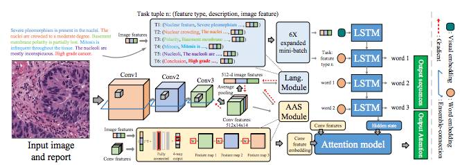 利用图像生成文字描述在计算机视觉中领域中叫做图像标注(Image captioning)。MDNet 在技术上和图像标注相似,但是 MDNet 针对一些医学图像特有问题会有一些特定的解决方案,使得 MDNet 在准确率上高于一般的图像标注方法(实验部分会说明)。在下文中,本文就三个模块一一进行介绍。