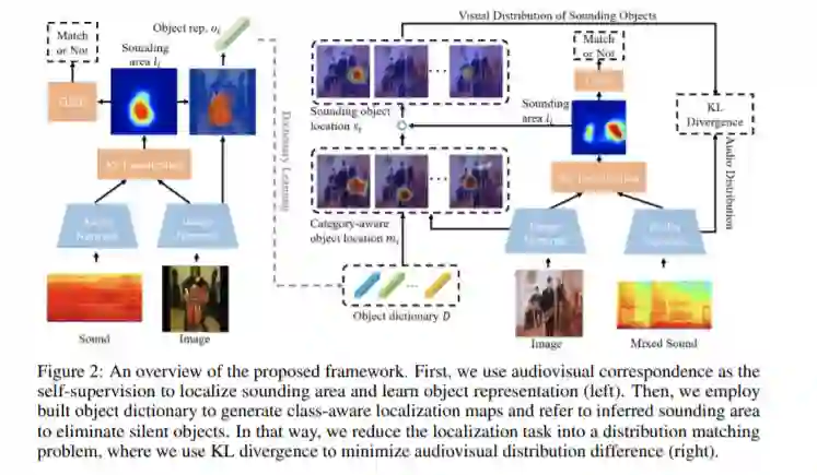 如何在具有多种声源的『鸡尾酒会』中区分不同的声音对象,这对人类来说是一项基本能力,但对当前的机器而言却仍然极具挑战!为此,本文提出一种基于课程学习策略的两阶段框架,实现了自监督下不同发声物体的判别性感知与定位。首先,我们提出在单声源场景中聚合候选声音定位结果以学习鲁棒的物体表征。进而在鸡尾酒会情景中,参考先期课程学习到的物体知识以生成不同物体的语义判别性定位图,通过将视音一致性视为自监督信息,匹配视音类别分布以滤除无声物体和选择发声对象。大量基于合成和真实多声源场景的实验表明,本文所提模型能够实现在无语义类别标注情形下,同时滤除无声物体和指出发声物体的明确位置并判定其类别属性,这在视觉多声源定位上尚属首次。