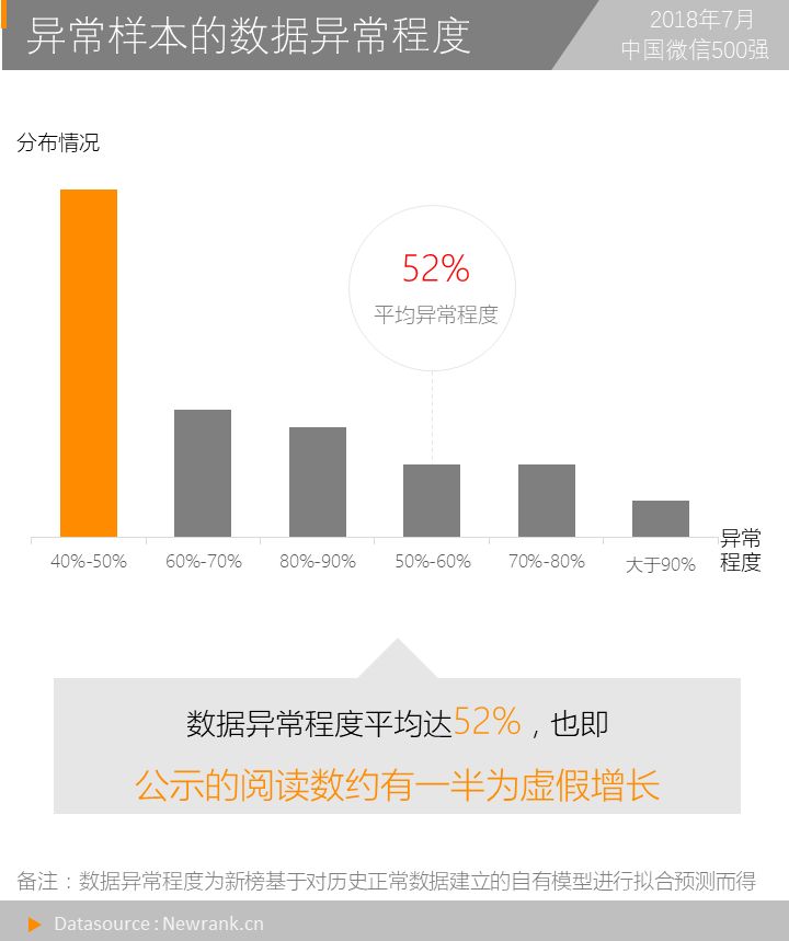 新榜基于历史获取的分钟监测数据绘制了阅读数据增长模型,根据模型去拟合出每篇异常内容的真实阅读数。观察可知在这些异常样本的阅读数中有52%为虚假增长,即每100个阅读数中,仅48个是有效阅读数。(以上数据基于拟合模型计算而得,仅供参考)
