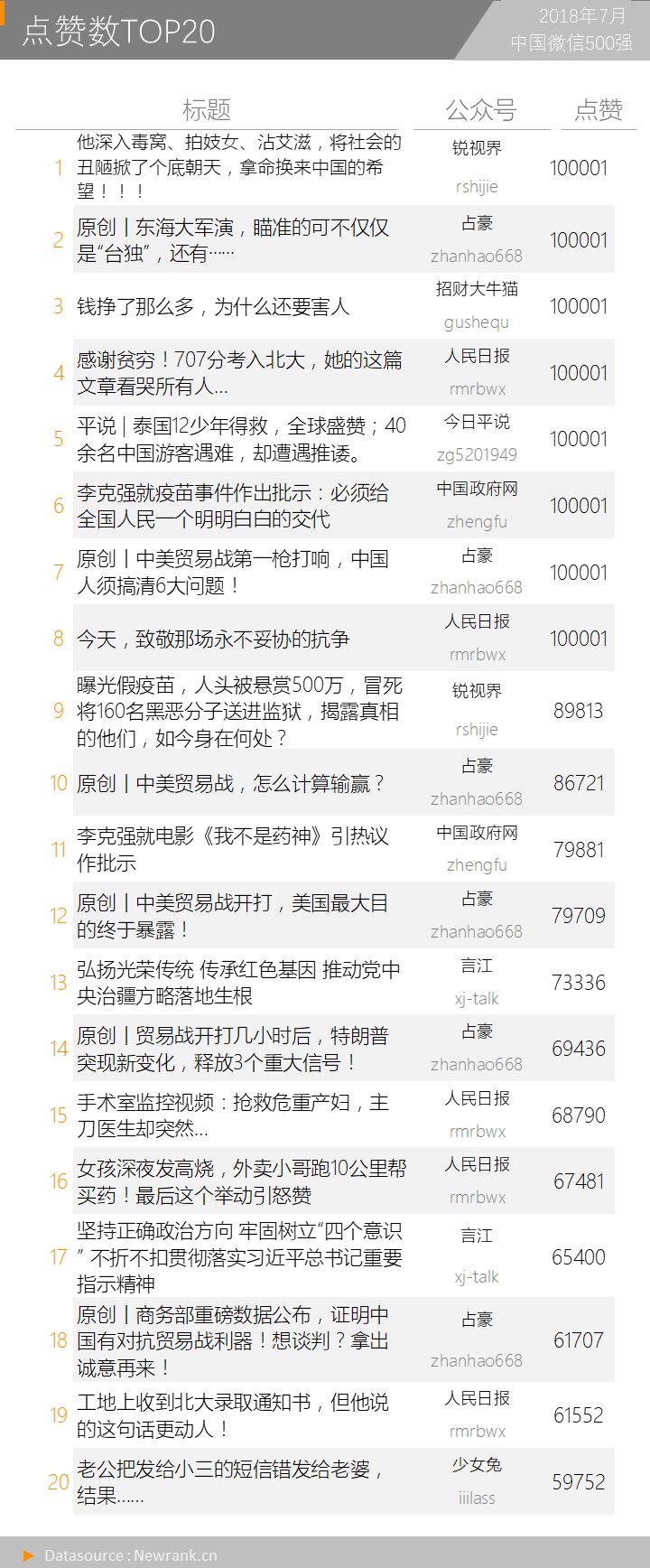 本月点赞十万加的内容共计8篇,“占豪”和“人民日报”各占2篇;另外“锐视界”的《他深入毒窝、拍妓女、沾艾滋,将社会的丑陋掀了个底朝天,拿命换来中国的希望!!!》,“招财大牛猫”的《钱挣了那么多,为什么还要害人》,“今日平说”的《平说| 泰国12少年得救,全球盛赞;40余名中国游客遇难,却遭遇推诿。》,“中国政府网”的《李克强就疫苗事件作出批示:必须给全国人民一个明明白白的交代》均获赞十万加。